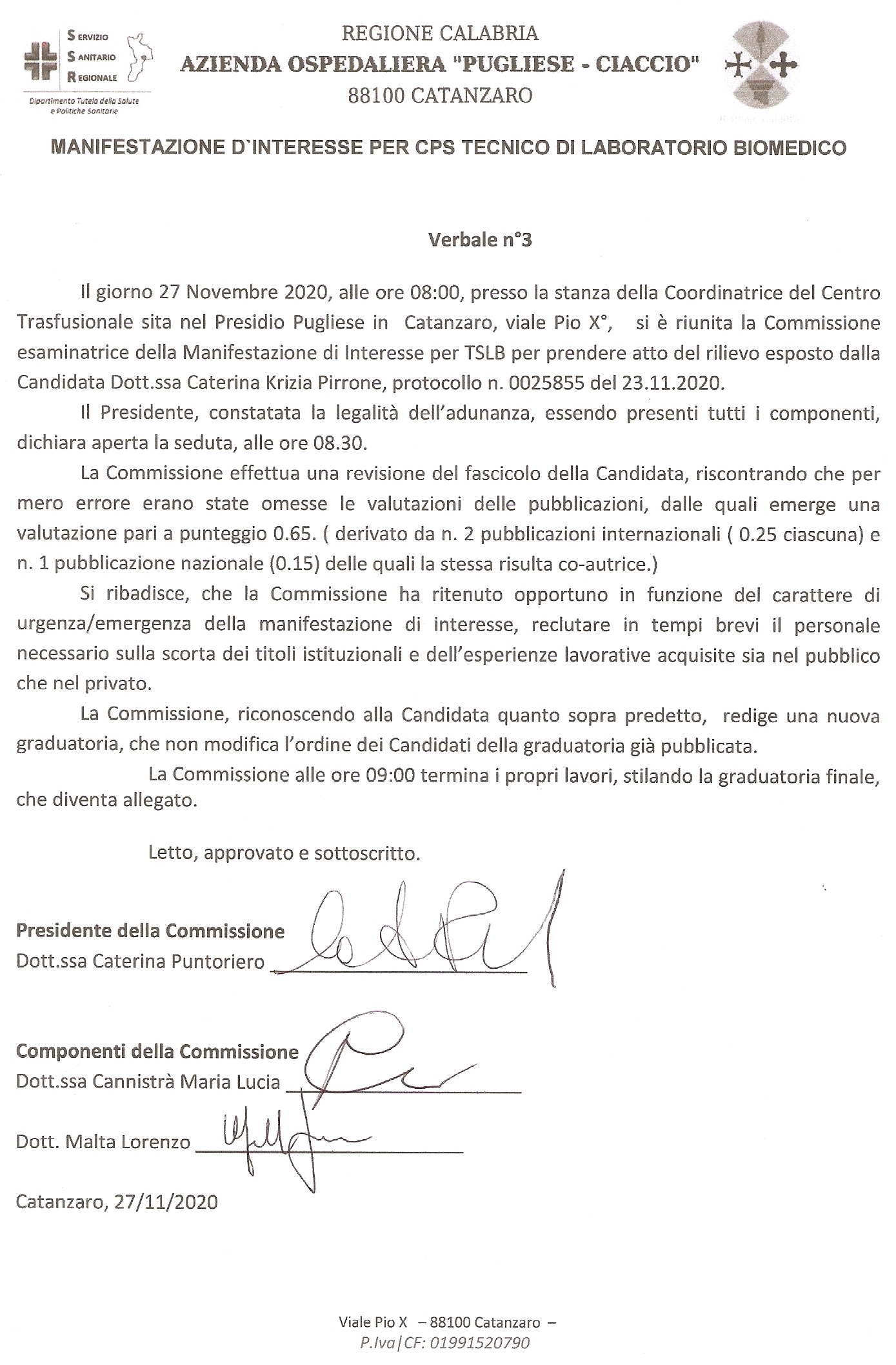 Graduatoria Finale manifestazione di interesse per Tecnico di Laboratorio Biomedico