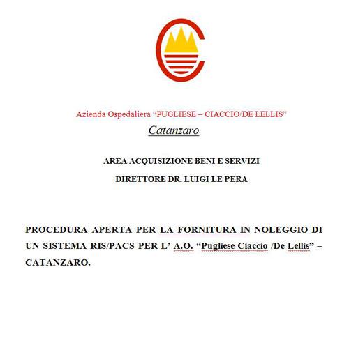 Procedura aperta per la fornitura in noleggio di un sistema RIS PACS per Azienda Ospedaliera Pugliese-Ciaccio De lellis – CZ