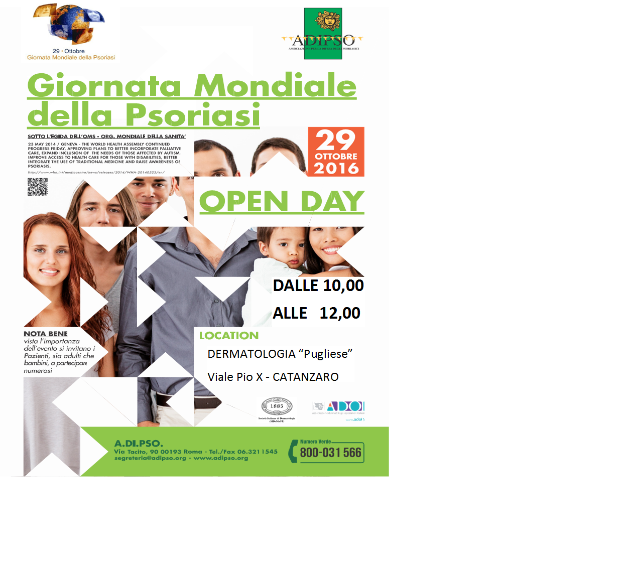 In occasione della giornata mondiale della psoriasi indetta dall'associazione ADIPSO (associazione dei pazienti affetti da Psoriasi) il prossimo sabato 29 ottobre 2016 l'U.O. di Dermatologia dell'Azienda Ospedaliera Pugliese-Ciaccio e tutto il personale saranno a disposizione dei pazienti affetti da tale patologia per esplicitare le precisazioni diagnostiche ed eventuali possibili terapie.