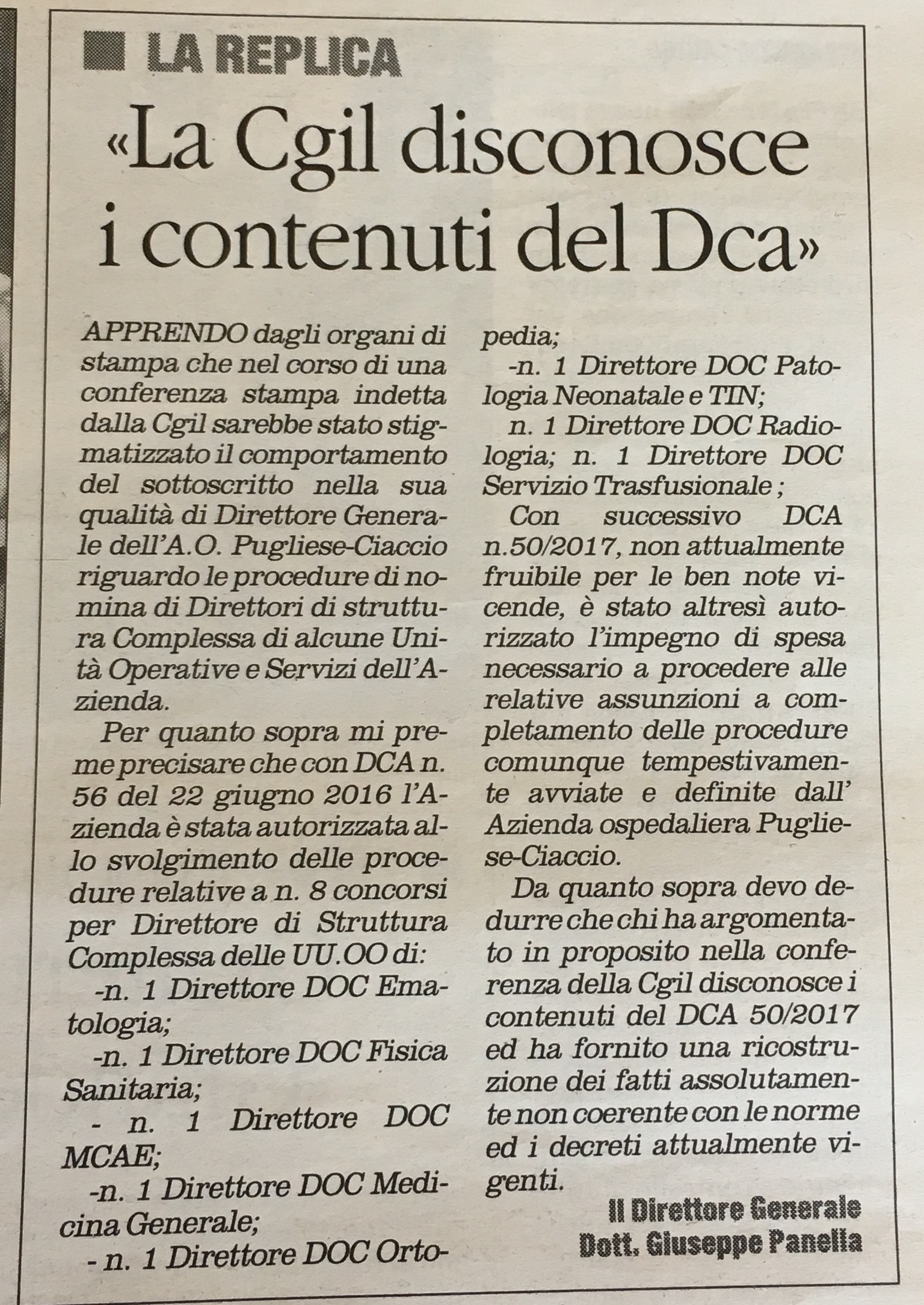 2 agosto 2017 - Il Quotidiano del Sud - "La Cgil disconosce i contenuti del DCA"